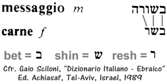 Nell'orecchio la vibrazione del timpano che si trasforma nel nervo in messaggio bioelettrico NON ESISTE. Non c'è un mago che con un gioco di prestigio trasforma ciò che è materiale come l'onda sonora, in messaggio immateriale. Messaggio e carne sono già la stessa realtà: il primo è immateriale, la seconda no. Ecco perché in ebraico "bessàr" (בשר) e "bessuràh" (בשורה), rispettivamente "carne" e "messaggio", si scrivono con la stessa radice "bsr" (בשר):